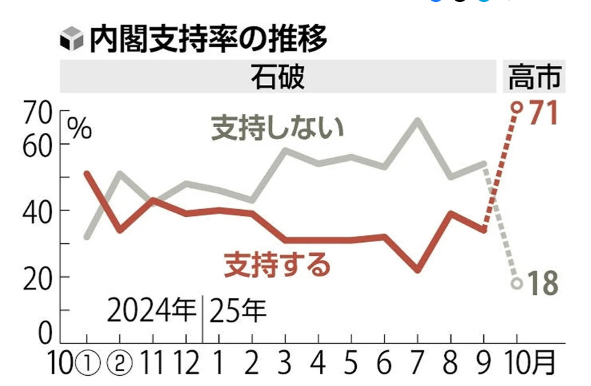 また、笑顔やパフォーマンスも石破前首相と対照的です。米海軍横須賀基地で空母に乗り、トランプ元大統領と共に拳を突き上げる姿は、SNSで大きな話題となり、そのギャップが一段と高市首相の人気を押し上げているように感じます。